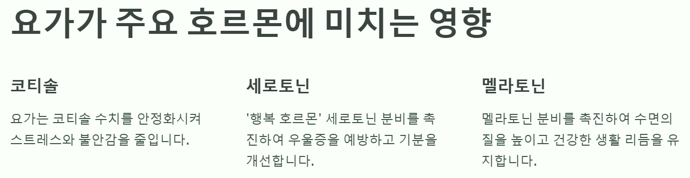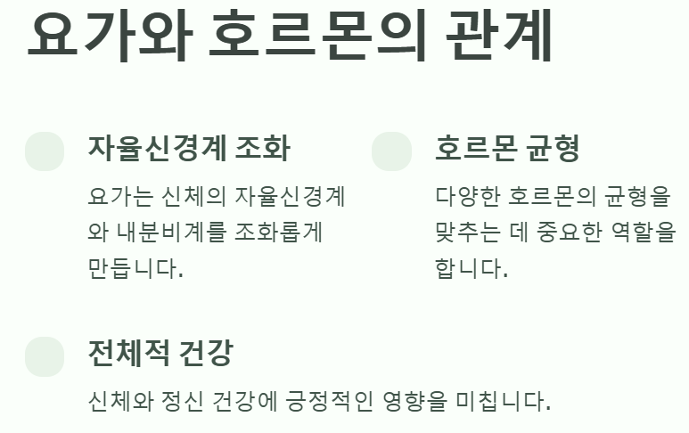 요가는 신체의 자율신경계와 내분비계를 조화롭게 만들어주며, 다양한 호르몬의 균형을 맞추는 데 중요한 역할을 합니다.