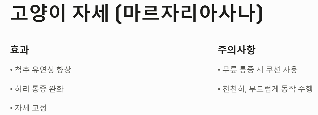 효과: 척추 유연성 향상, 허리 통증 완화, 자세 교정에 도움
