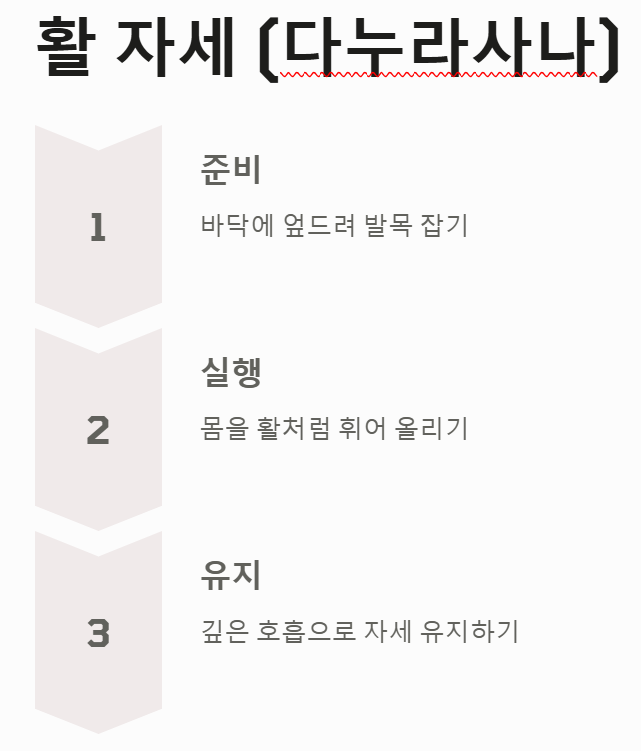 이 자세는 허벅지와 복부 근육을 강화하고 척추의 유연성을 높이는 데 특히 유용합니다. 바닥에 엎드린 상태에서 발목을 잡고 몸을 활처럼 휘게 하며, 깊은 호흡을 통해 자세를 유지합니다.