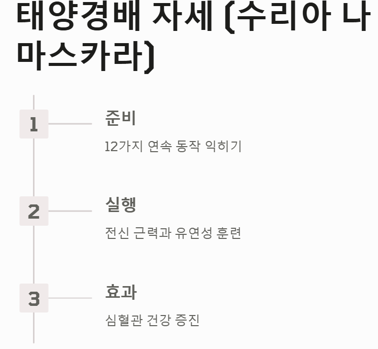 태양경배 자세는 12가지 동작이 연속적으로 연결되어 전신의 근력과 유연성을 동시에 길러주는 강력한 운동입니다. 이 자세는 근육을 활성화하고 심혈관 건강을 증진하는 데 탁월합니다.